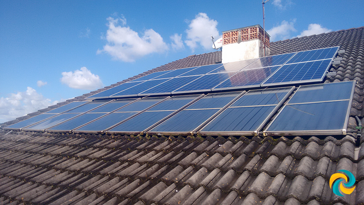 Na parte de cima temos um sistema fotovoltaico de geração de energia e embaixo um coletor solar para aquecimento de água.